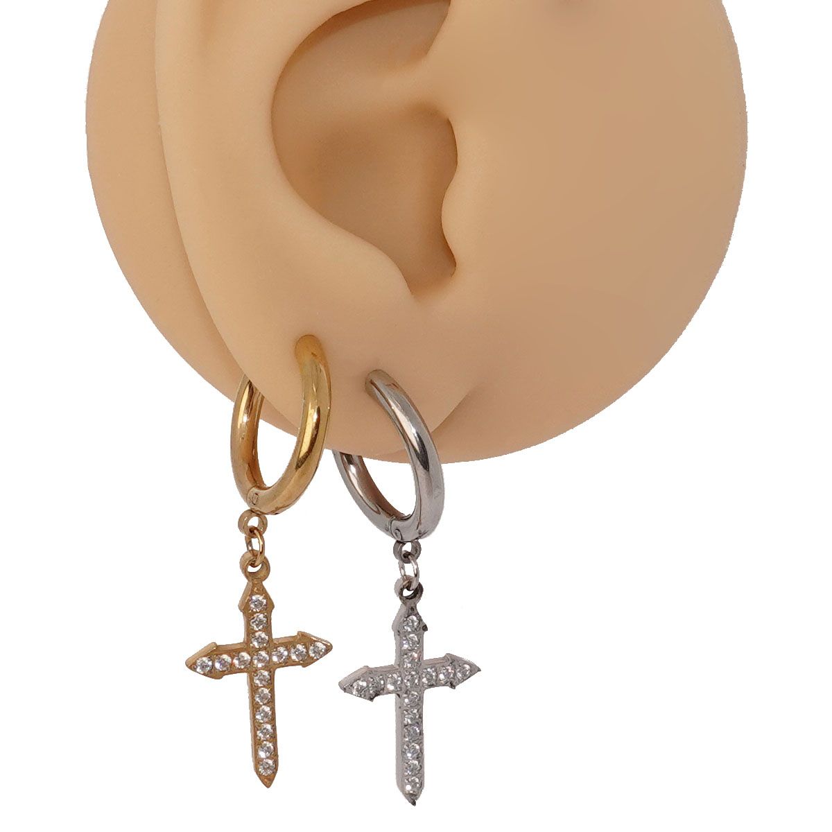O Par de Argola Com Pingente Cruz é produzido em Aço Cirúrgico, um material que não oxida. Conta com fecho em click, o que facilita colocar e tirar a peça e um pingente com formato de cruz com zircônias cravejadas. O modelo dourado passa por coloração pelo processo PVD*
