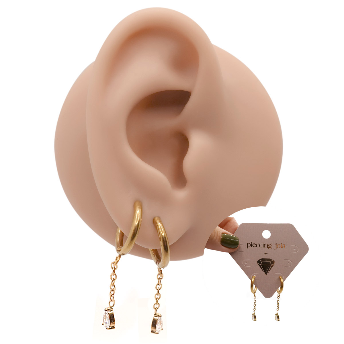 O Par de Brinco Pingente Gota é produzido em Aço Cirúrgico, um material que não oxida. Conta com corrente que se conecta do brinco a tarracha e do brinco ao pingente deixando um efeito ainda mais bonito. O modelo dourado e o rose passam por coloração pelo processo PVD*