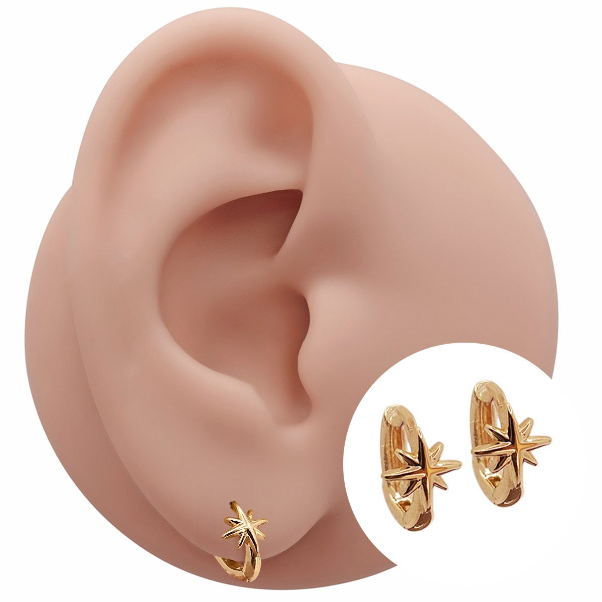 O Par de brincos estrela shine conta com fechamento com tarraxa, é produzidas em metal com Folheado dourado de 3 milésimo, que oferece uma cor mais viva e brilhante às peças além de uma camada de proteção.
