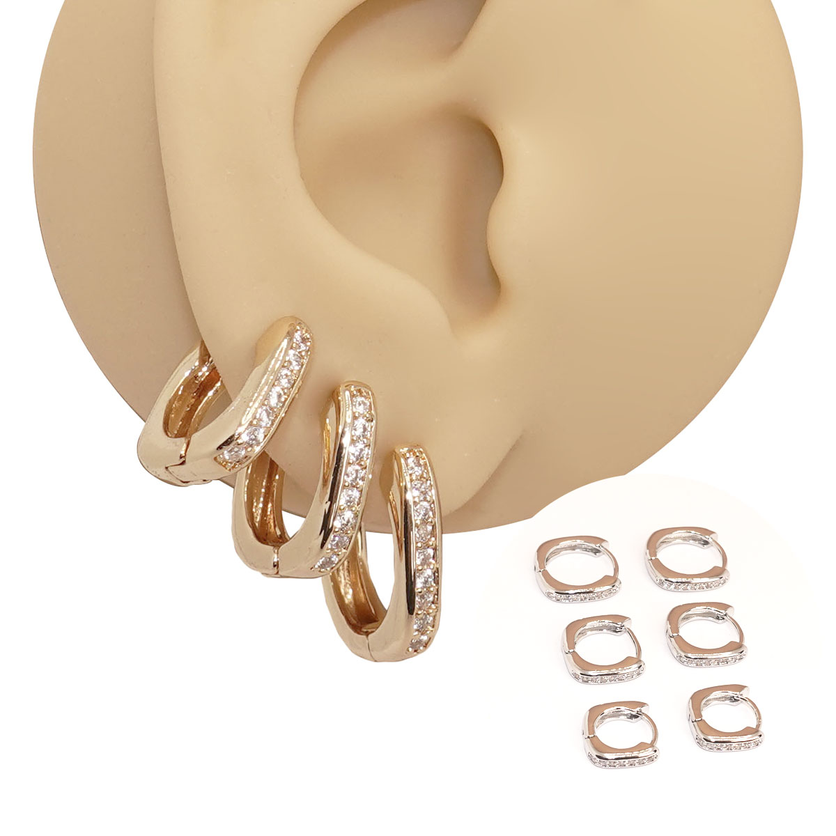 Mix Brincos Folheado Argola Formato Quadrado Bold conta com fecho clicker produzidas em metal com banho dourado de 3 milésimos, que oferece uma cor mais viva e brilhante às peças além de uma camada de proteção. O kit vem com três tamanhos de peças para serem usadas tanto juntas como separadas. Conta com aplicação de zircônias