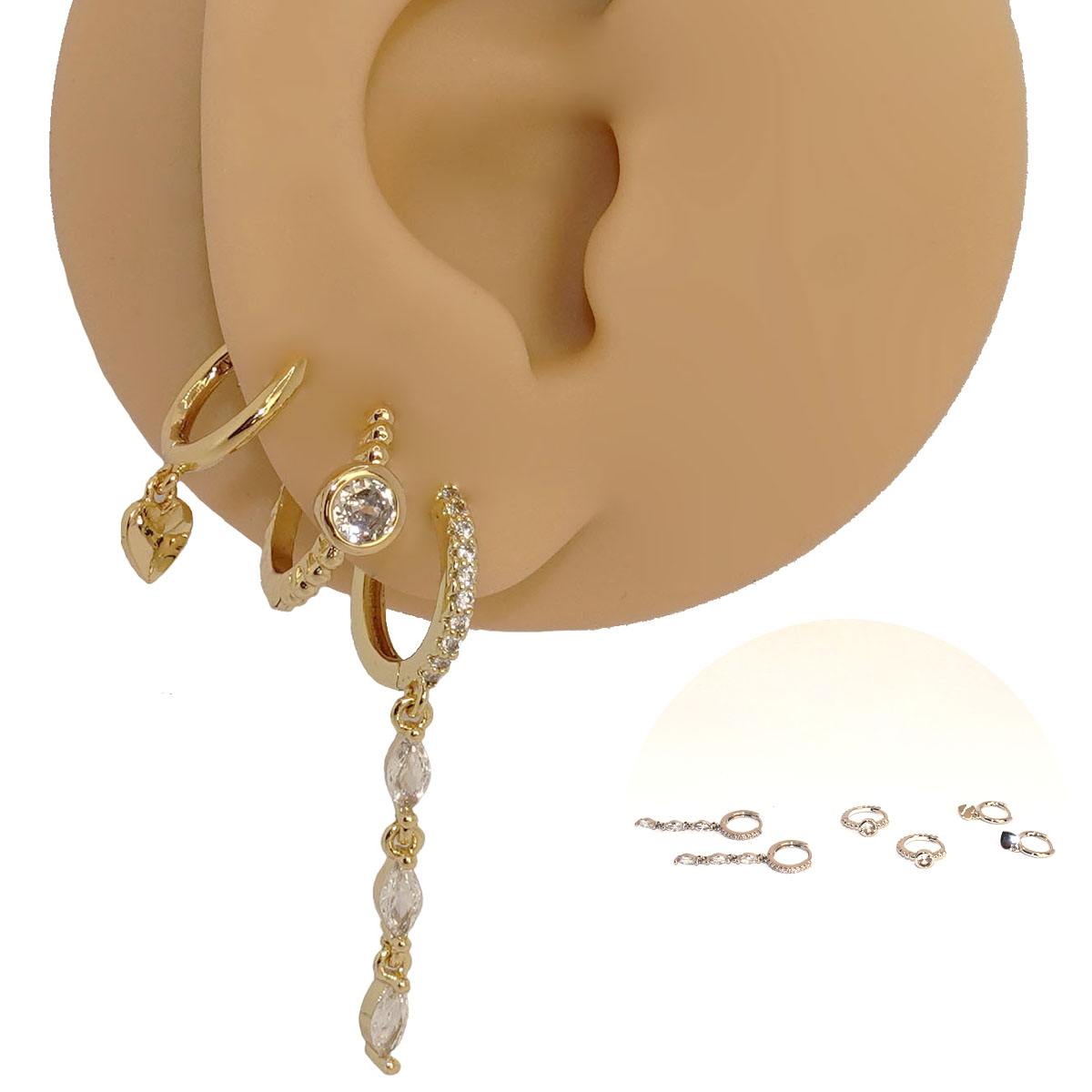 Mix Brincos Folheado Losango Zircônias conta com fecho clicker produzidas em metal com banho dourado de 3 milésimos, que oferece uma cor mais viva e brilhante às peças além de uma camada de proteção. O mix vem com argola com pingente de coração, argola com zircônia redonda e argola com pingentes em formato de losango.