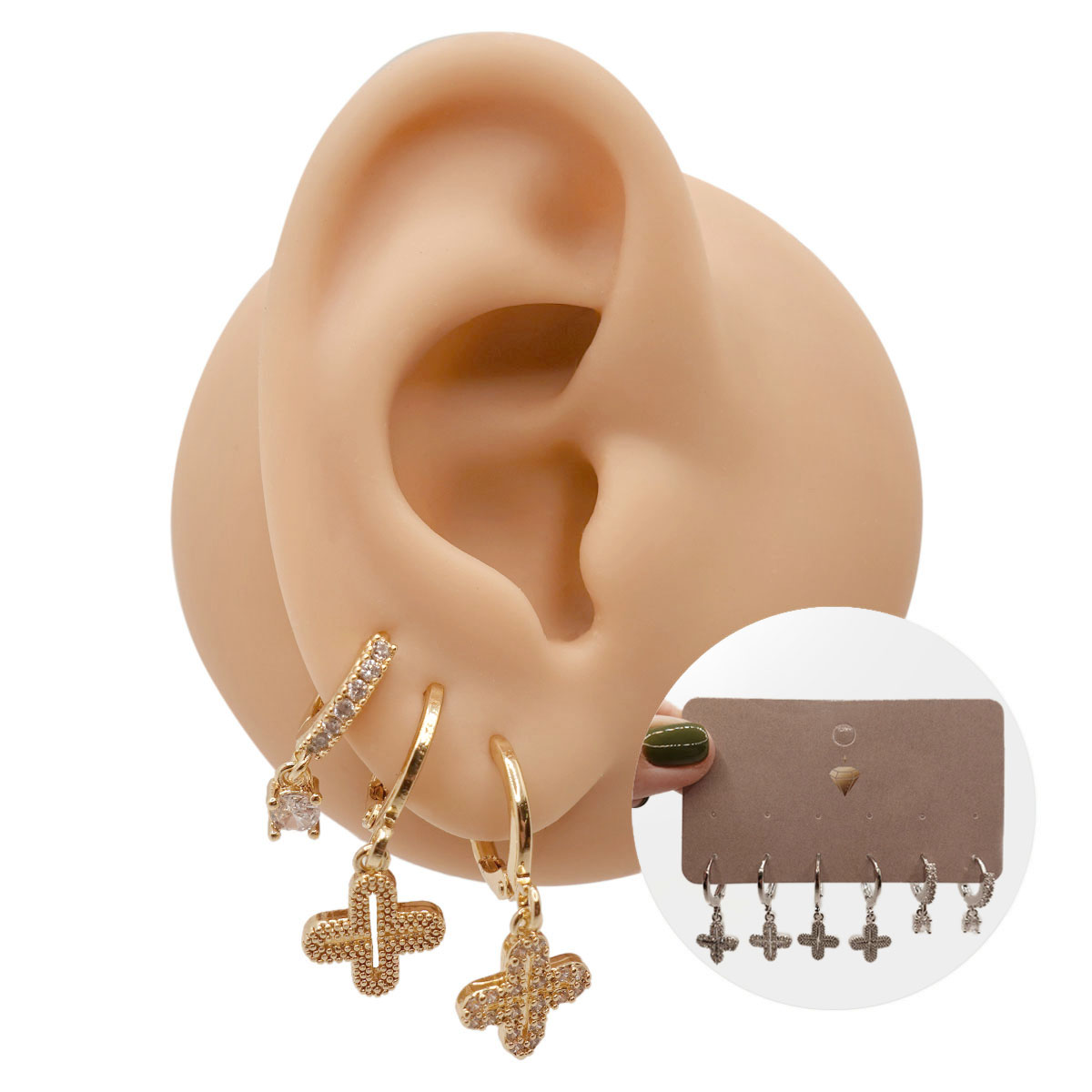 Mix Brincos Folheado Argolas Cruz Zircônia produzidos em metal com banho dourado de 3 milésimos, que oferece uma cor mais viva e brilhante às peças além de uma camada de proteção. O kit vem com 3 pares de brincos diferentes para fazer um visagismo bem interessante na sua orelha.