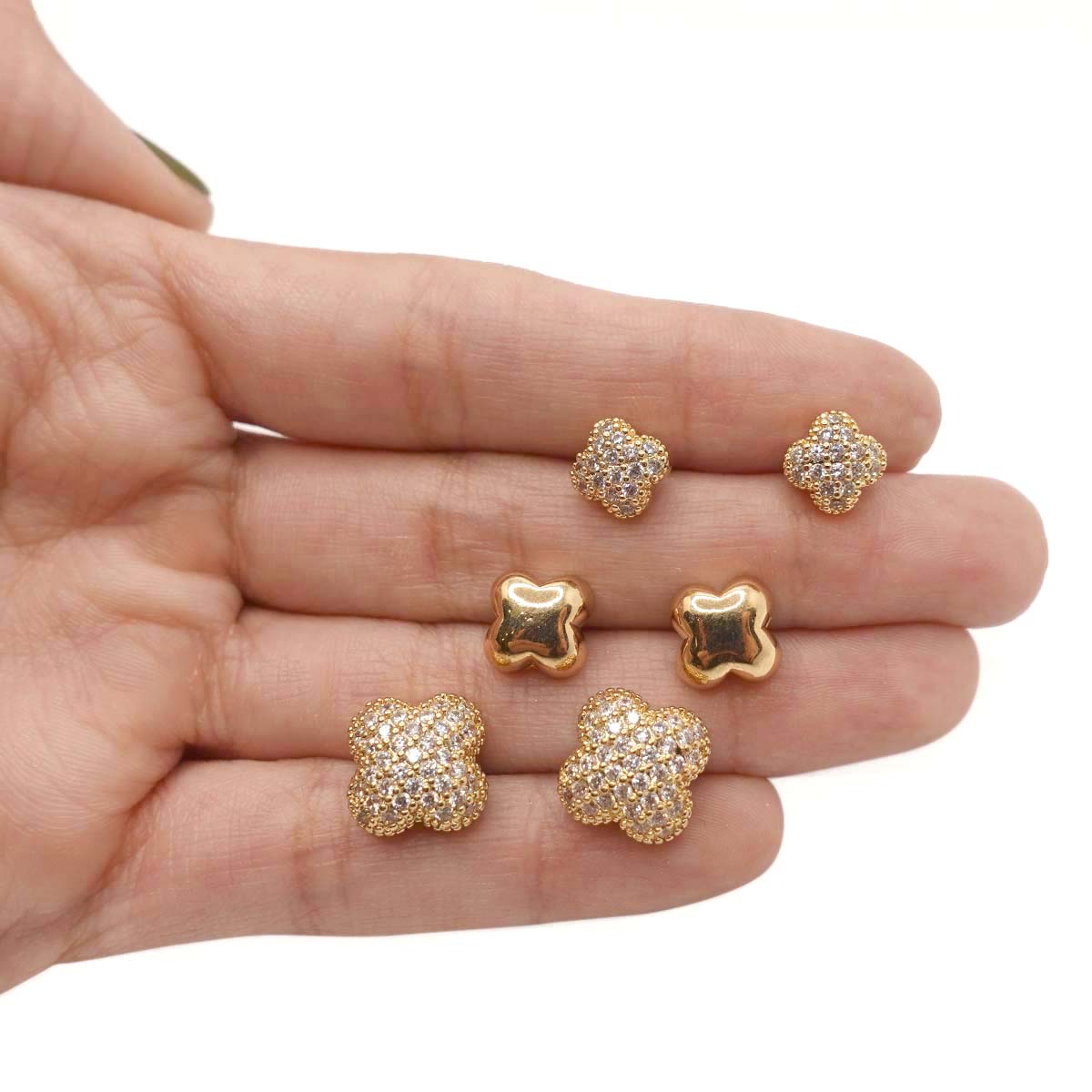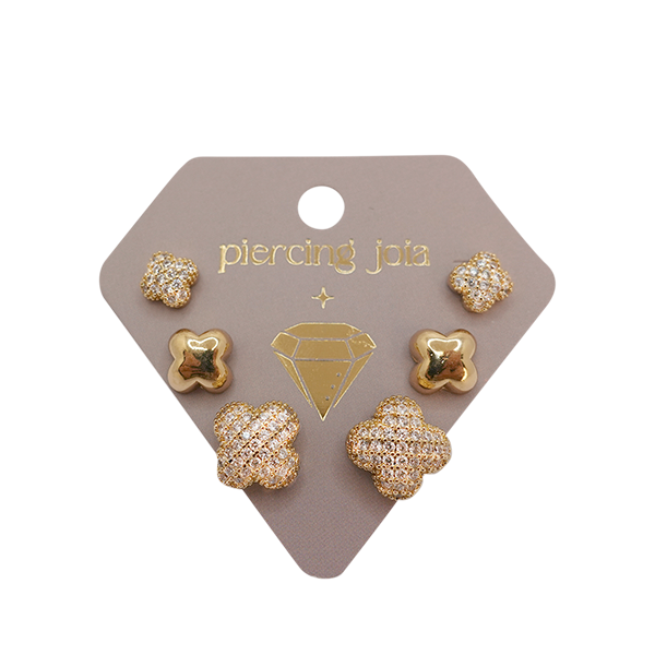 Mix Brincos Folheado Trevos Zircônia conta com fecho de tarrachas, brincos produzidos em metal com banho dourado de 3 milésimos, que oferece uma cor mais viva e brilhante às peças além de uma camada de proteção. O kit vem com 3 pares de brincos diferentes para fazer um visagismo bem interessante na sua orelha.