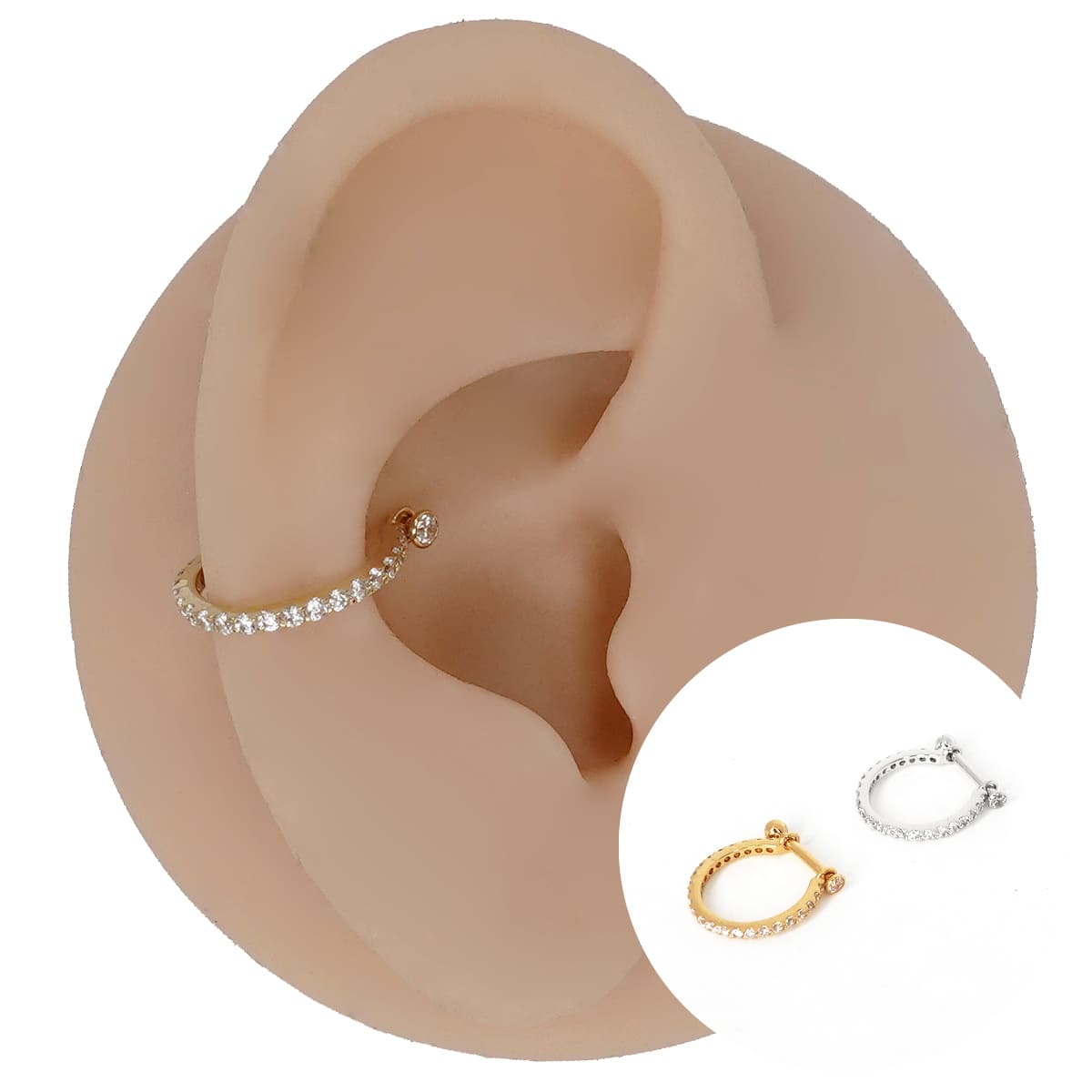 O Piercing Argola Zircônias é produzido em Aço Cirúrgico, um material que não oxida. Conta com aplicação de zircônias na argola e cristais na base reta, que é rosqueável nas duas extremidades. O modelo dourado passa por coloração pelo processo PVD*