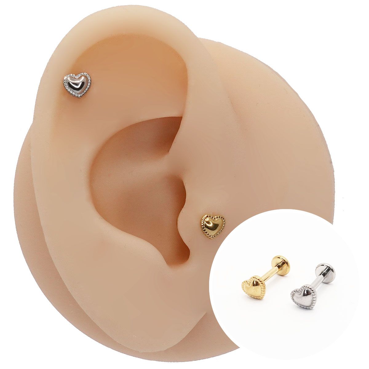 O Piercing Labret Coração é produzido em Aço Cirúrgico, um material que não oxida. O modelo tem o topo com formato de coração e o seu fecho é com rosca interna. O modelo dourado passa por coloração pelo processo PVD*