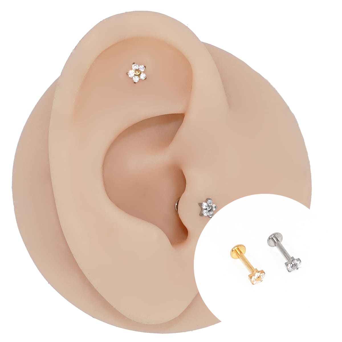 O Piercing Labret Flor Zircônia é produzido em Aço Cirúrgico, um material que não oxida. Conta com aplicação de zircônias no seu topo com formato de flor e é rosqueável com rosca interna. O modelo dourado passa por coloração pelo processo PVD*