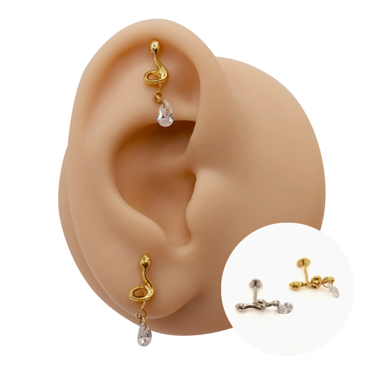 O Piercing Labret em Titânio Cobra Pingente Gota, o material mais biocompatível com nosso corpo, com uma zircônia e com rosca interna e é rosqueável no desenho. O modelo dourado passa pelo processo de coloração PVD*