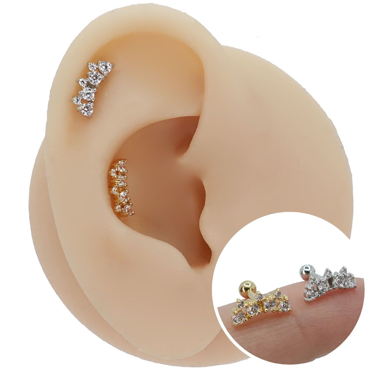 O Piercing Coroa é um microbell produzido em Ouro 18K, um material antialérgico, que conta com rosca externa e com Aplicação de zircônias