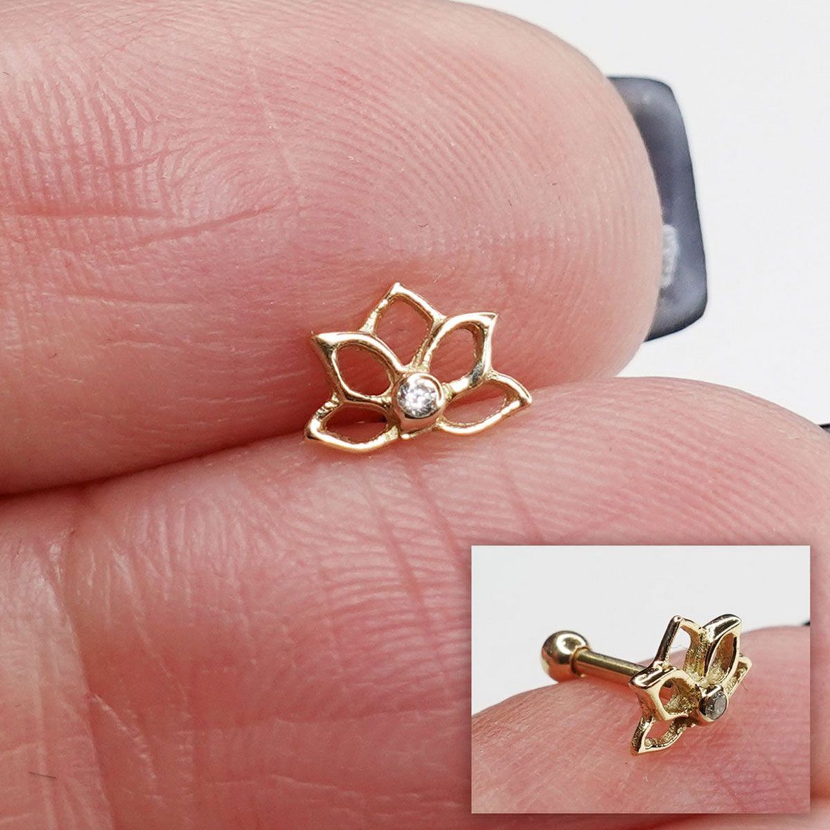 O Piercing Microbell Lótus Vazada é produzido em ouro 18k, um material antialérgico, conta com uma zircônia no meio e é rosqueável na bolinha contando com rosca externa.