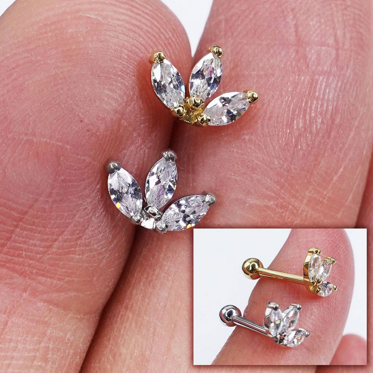 O Piercing Microbell Lótus é produzido em Ouro 18k, um material antialérgico, com aplicação de zircônias e é rosqueável na bolinha em formato de rosca externa.