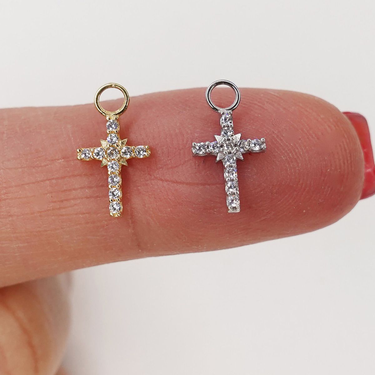 O Pingente Cruz é produzido em Ouro 18k, um material antialérgico. Ele conta com aplicação de zircônias suiças e é feito para ser usado em brincos argolhinhas fininhas.
