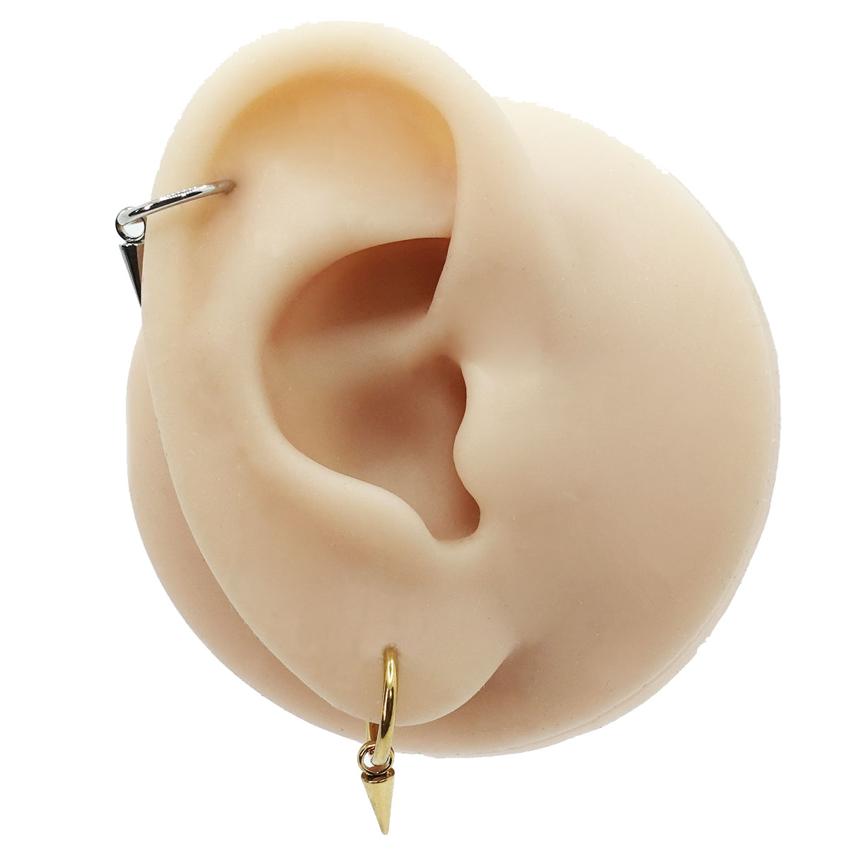O Pingente Spike é produzido em titânio, o material mais biocompatível com o nosso corpo. É fabricado para usar como decoração em argolas fininhas com calibre de até 2mm. O modelo dourado passa pelo processo de coloração PVD*